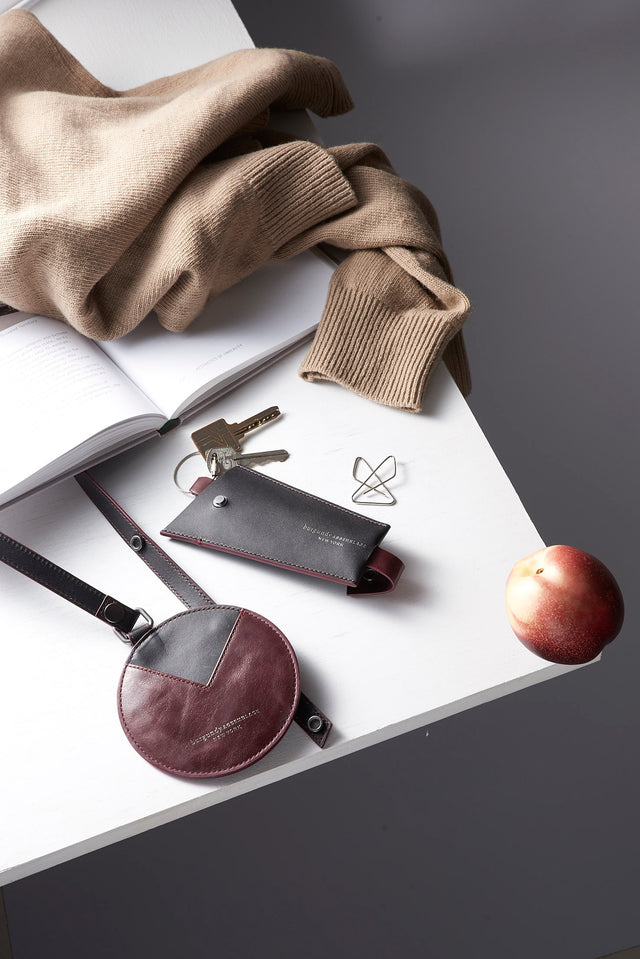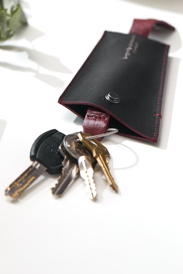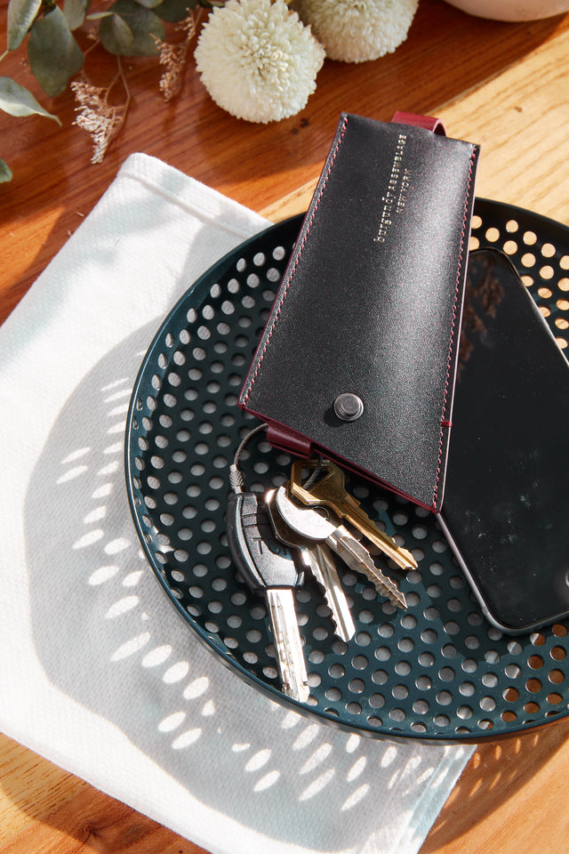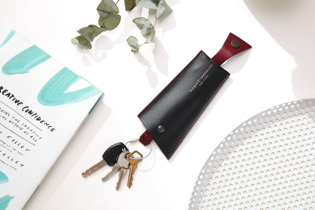 Iota makes carrying keys look like a fashion statement. Our slim leather key case can hold up to 8 keys at a time without appearing bulky. Keys attach to a burgundy leather strap and are secured inside the case by a subtle snap. Flip the snap to remove the keys; a quick tug of the strap pulls them back into the case. Sleek and minimal, Iota is made of vegetable-tanned leather with a resin-coated back for a comfortable feel.