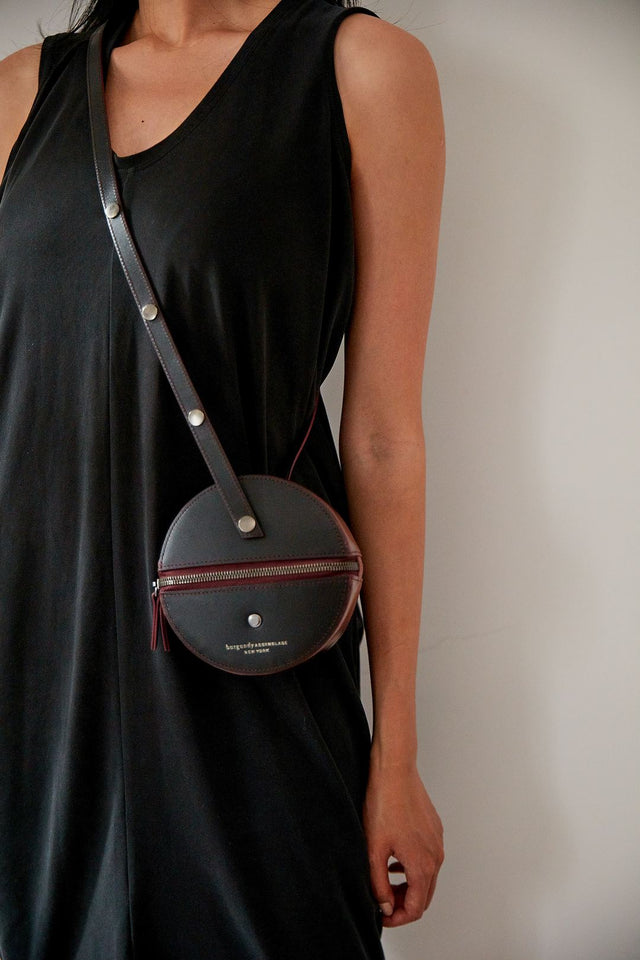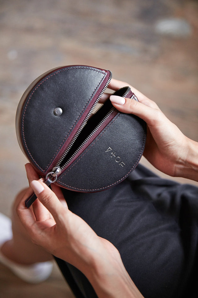 Get used to attracting attention when you’ve got Theta in your hand. This distinctive round utility case stylishly ferries your small items, from electronics cords to lipsticks and lotions. The burgundy and black clutch is made of vegetable-tanned leather and comes with an adjustable, removable handle. A two-way zipper scrolls around the body, dividing the case into perfect halves. The interior is lined in soft burgundy-colored cotton and discreetly-place interior snaps keeps items secure.
